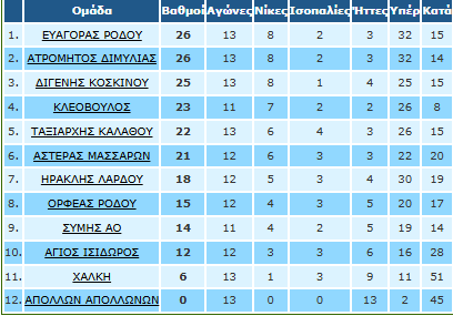 η βαθμολογία του 1ου ομίλου της Β κατηγορίας