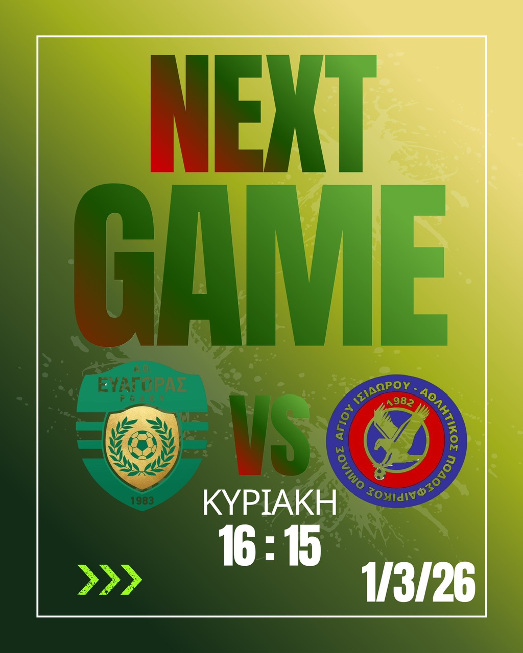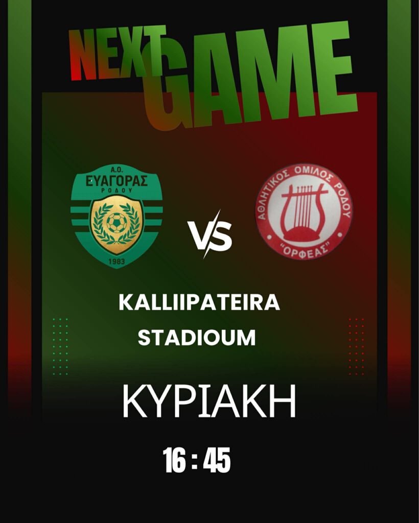 Tην Κυριακή 15/03/2026 16:45 στο ΕΑΚ (Αθλητικό κέντρο Καλλιπάτειρα) η ομάδα μας ΑΟ ΕΥΑΓΟΡΑΣ υποδέχεται την ομάδα της πόλης μας ΟΡΦΕΑΣ για την 16η αγωνιστική της Β κατηγορίας. Περιμένουμε όλους τους φίλους του ποδοσφαίρου να έρθουν και να στηρίξουν και να χειροκροτήσουν και τις 2 ομάδες . Σε αυτό το παιχνίδι θα τιμήσουμε ένα άνθρωπο του ποδοσφαίρου που πέρασε από πολλές ομάδες και ιδιαίτερα τον ΟΡΦΕΑ ΚΑΙ ΤΟΝ ΕΥΑΓΟΡΑ Τον κ. Σταυριανό Κωνσταντίνο (ΚΩΤΣΟ) για την πολυετή προσφορά του στο τοπικό μας ποδόσφαιρο.